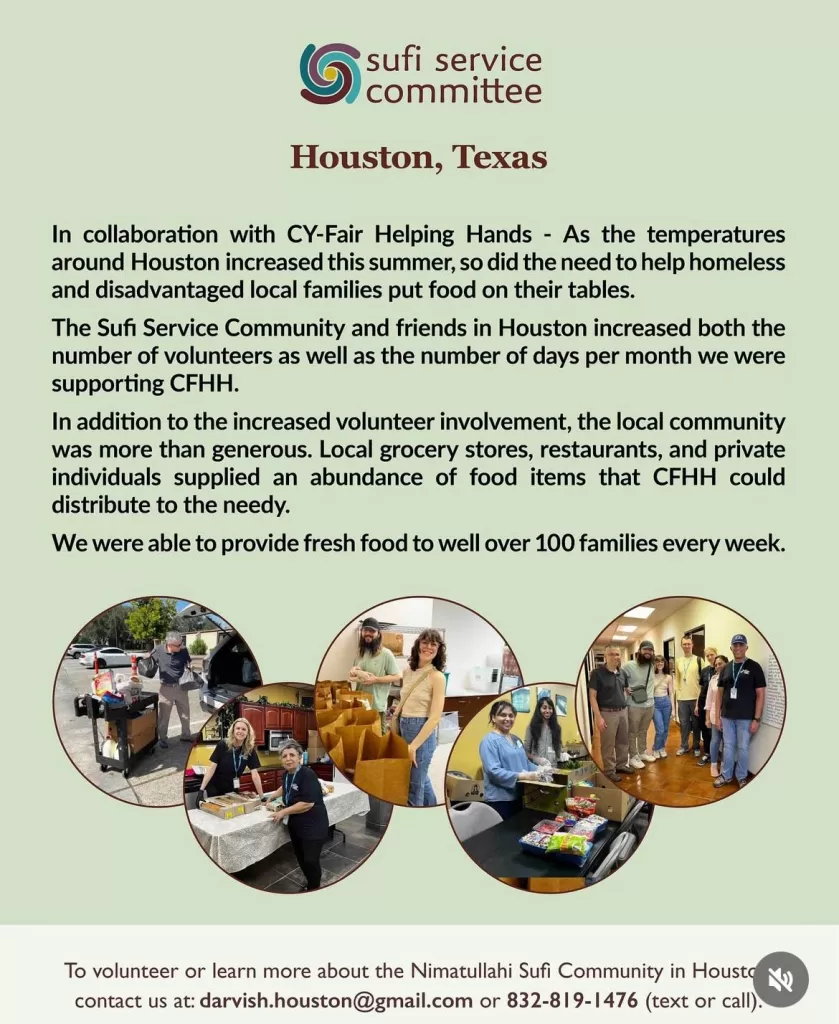 The Nimatullahi Sufi Center Houston’s community service was featured by Dr. Alireza Nurbakhsh on various social media platforms. Our community service in Houston revolves in helping alleviate hunger among disadvantaged families in the Houston metro area.